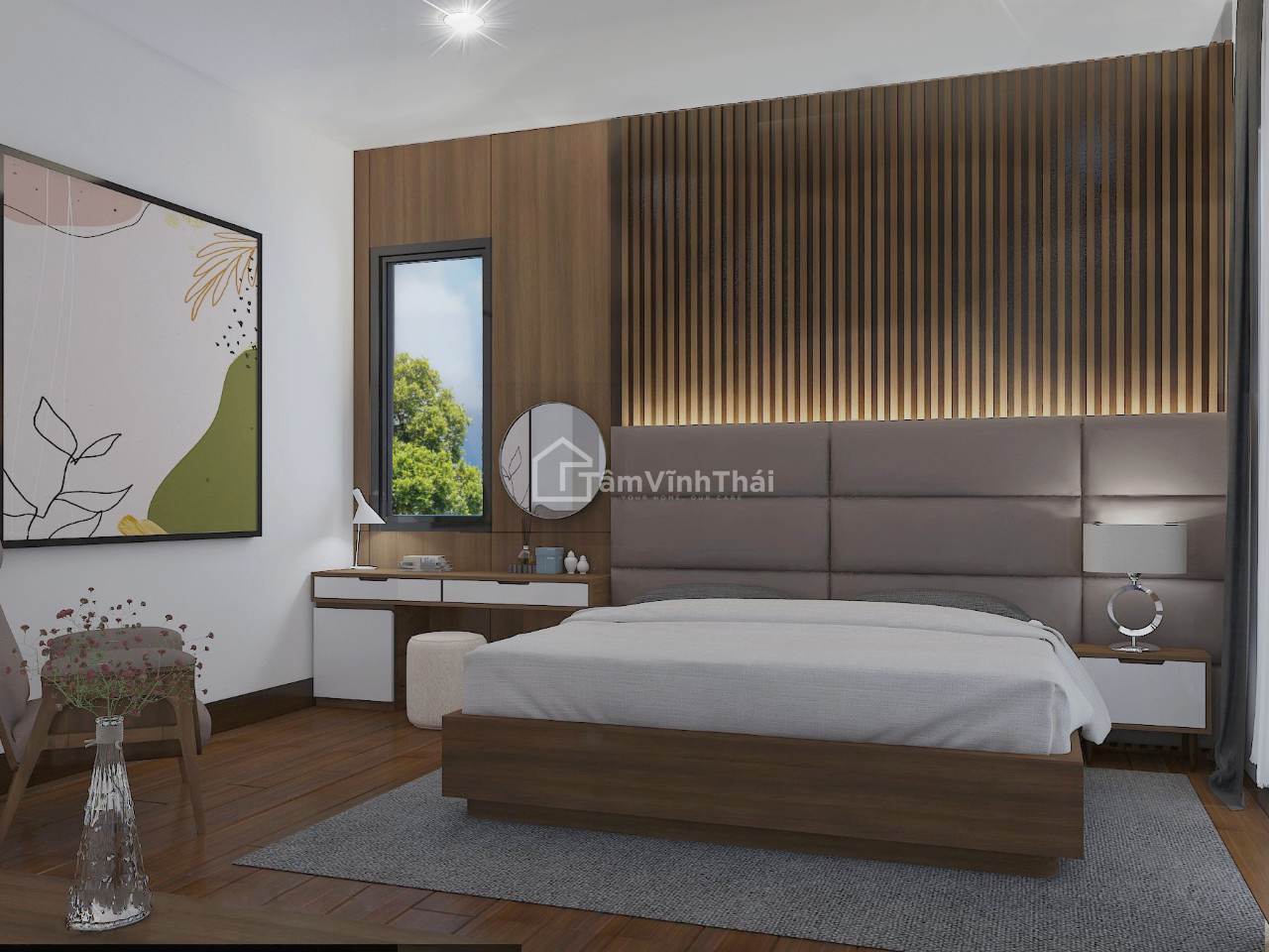 Điểm nổi bật của căn biệt thự là bộ sofa bọc da tạo sự sang trọng cho phòng khách. Từ đồ nội thất đến trang trí cùng với màu sắc đều được thiết kế có sự đồng nhất. Phòng ngủ sử dụng gam màu sẫm từ nội thất đồ gỗ được bố trí bắt mắt thể hiện được sự tinh tế và thẩm mỹ cho căn phòng.