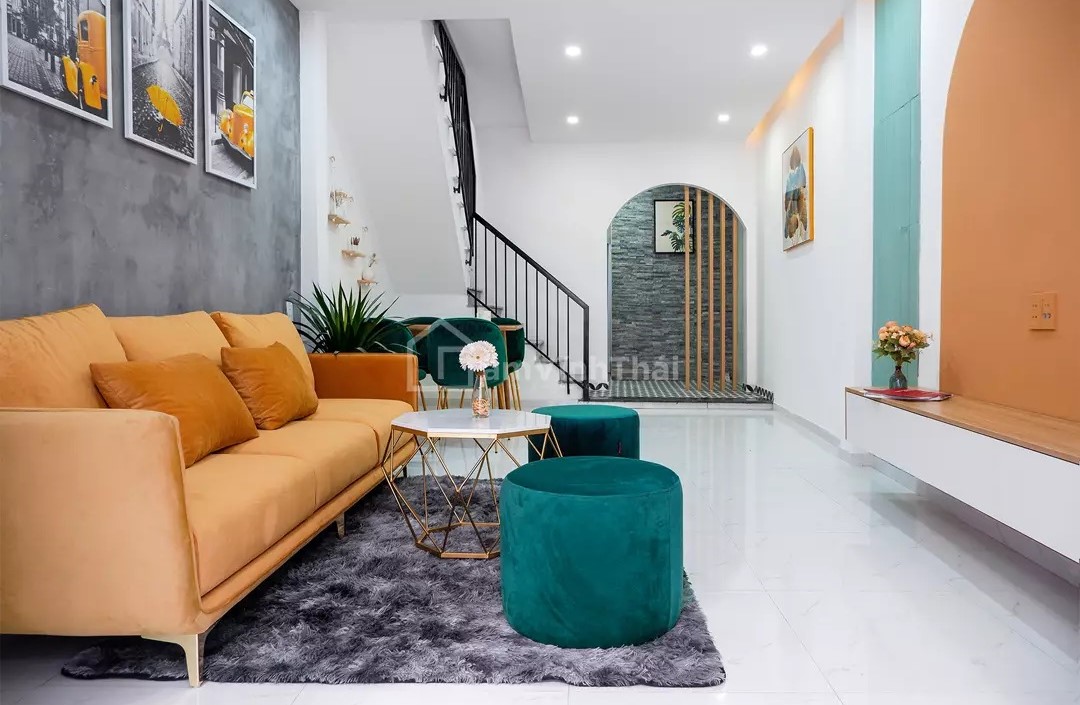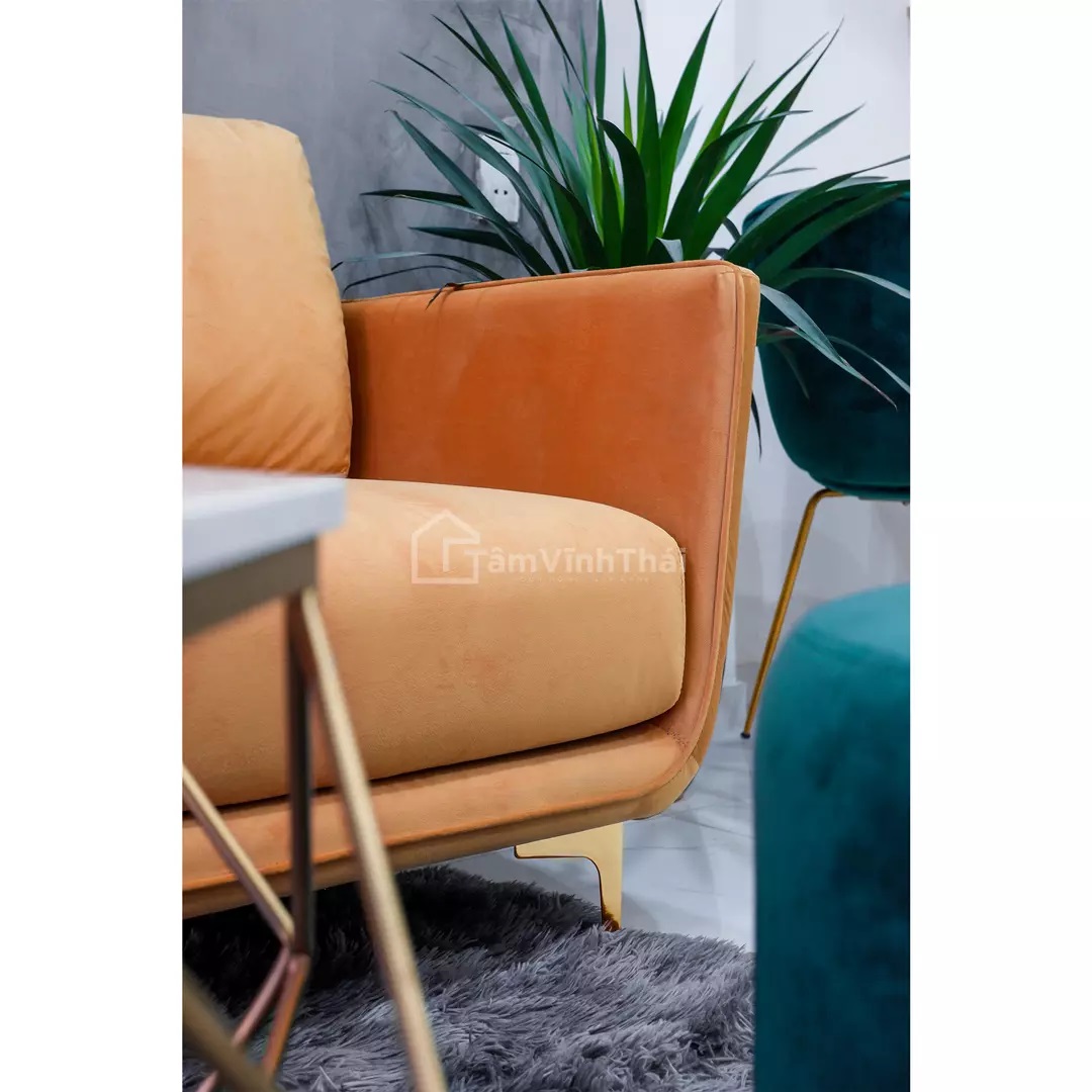 Một mẫu ghế mang đậm màu sắc nhiệt đới được chị Thương yêu cầu đặt đóng. Ngôi nhà của chị thuộc kiểu nhà ống vì vậy chị lựa chọn mẫu sofa băng để không chiếm quá nhiều diện tích không gian nhưng vẫn tiện dụng. Sử dụng hai tone màu chủ đạo vàng và xanh thêm phần nổi bật và ấn tượng cho phòng khách.