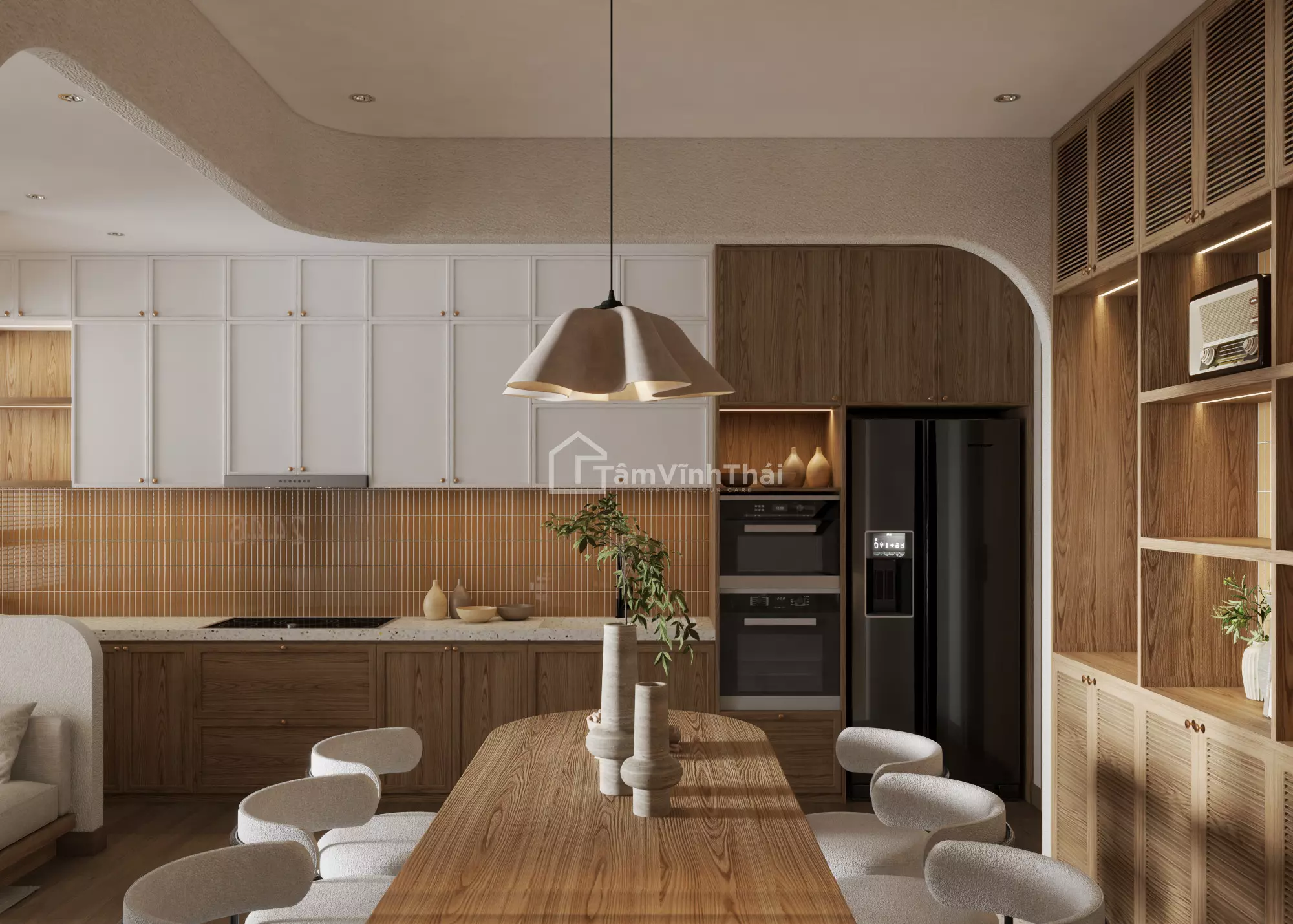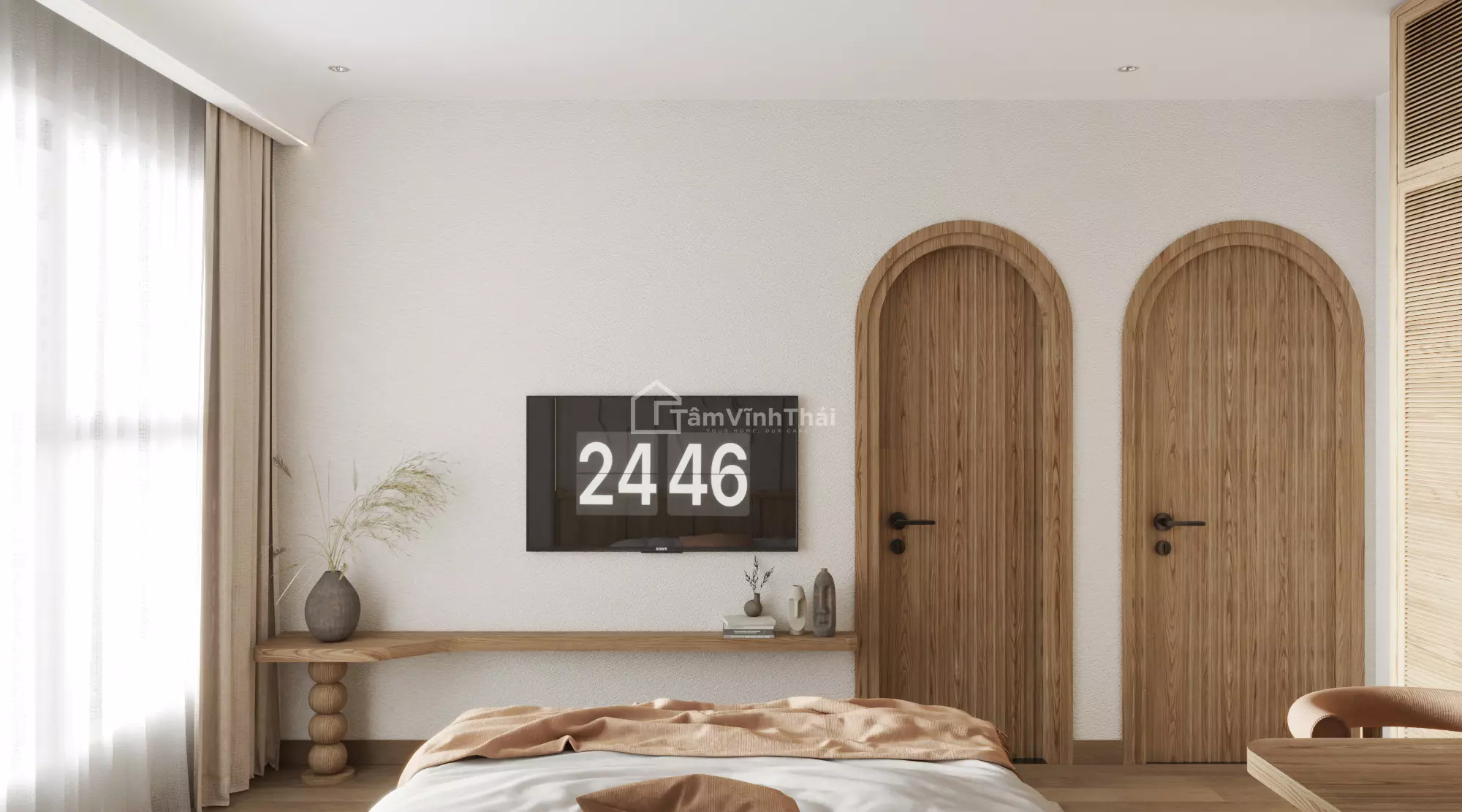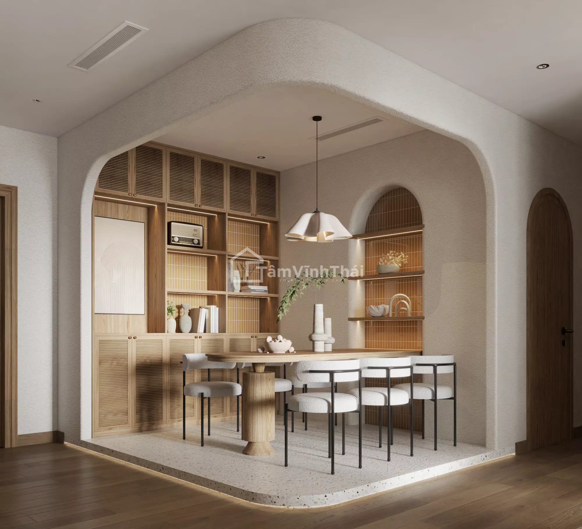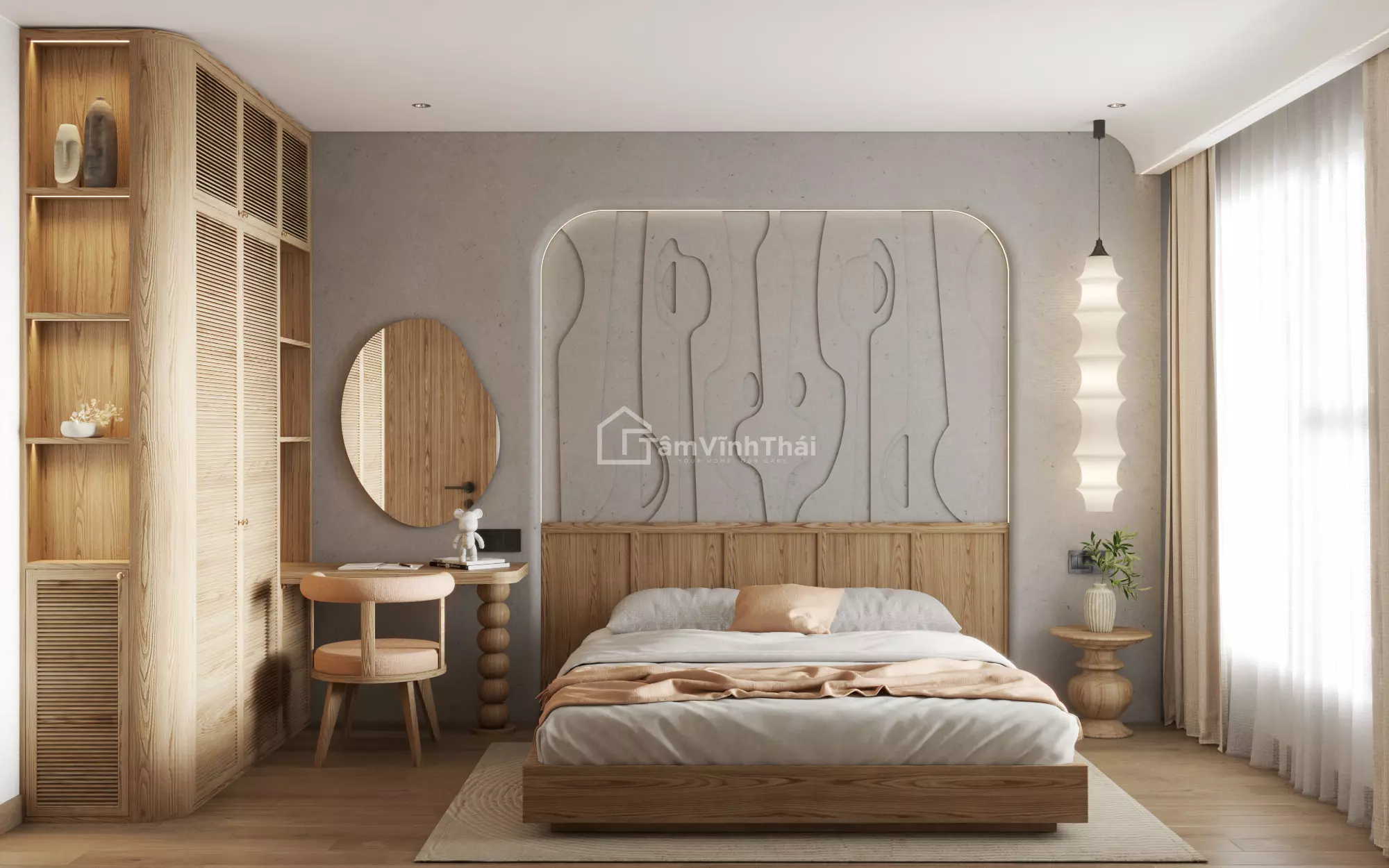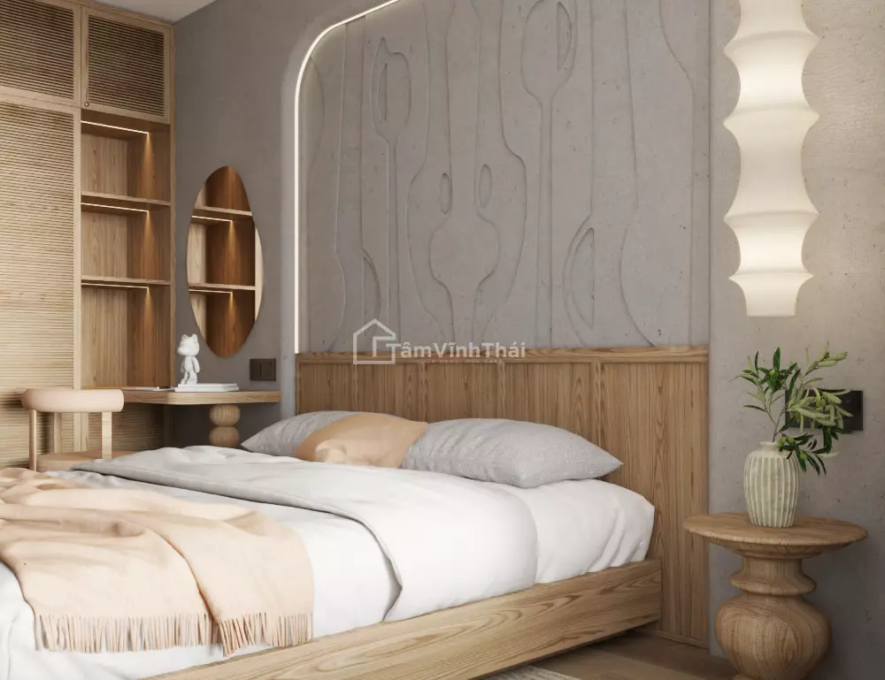 Sử dụng vật liệu thô mộc hoà phối cùng bẳng màu trung tính trắng – be – gỗ và nguồn ánh sáng tràn qua các ô cửa, tất cả mang đến cho gia chủ một không gian sống ngập tràn cảm giác yên bình và tĩnh lặng trong tâm hồn, hình thành mối liên hệ sâu sắc với tự nhiên và cảm nhận những hạnh phúc gói gọn trong vẻ đẹp nguyên sơ vốn có…