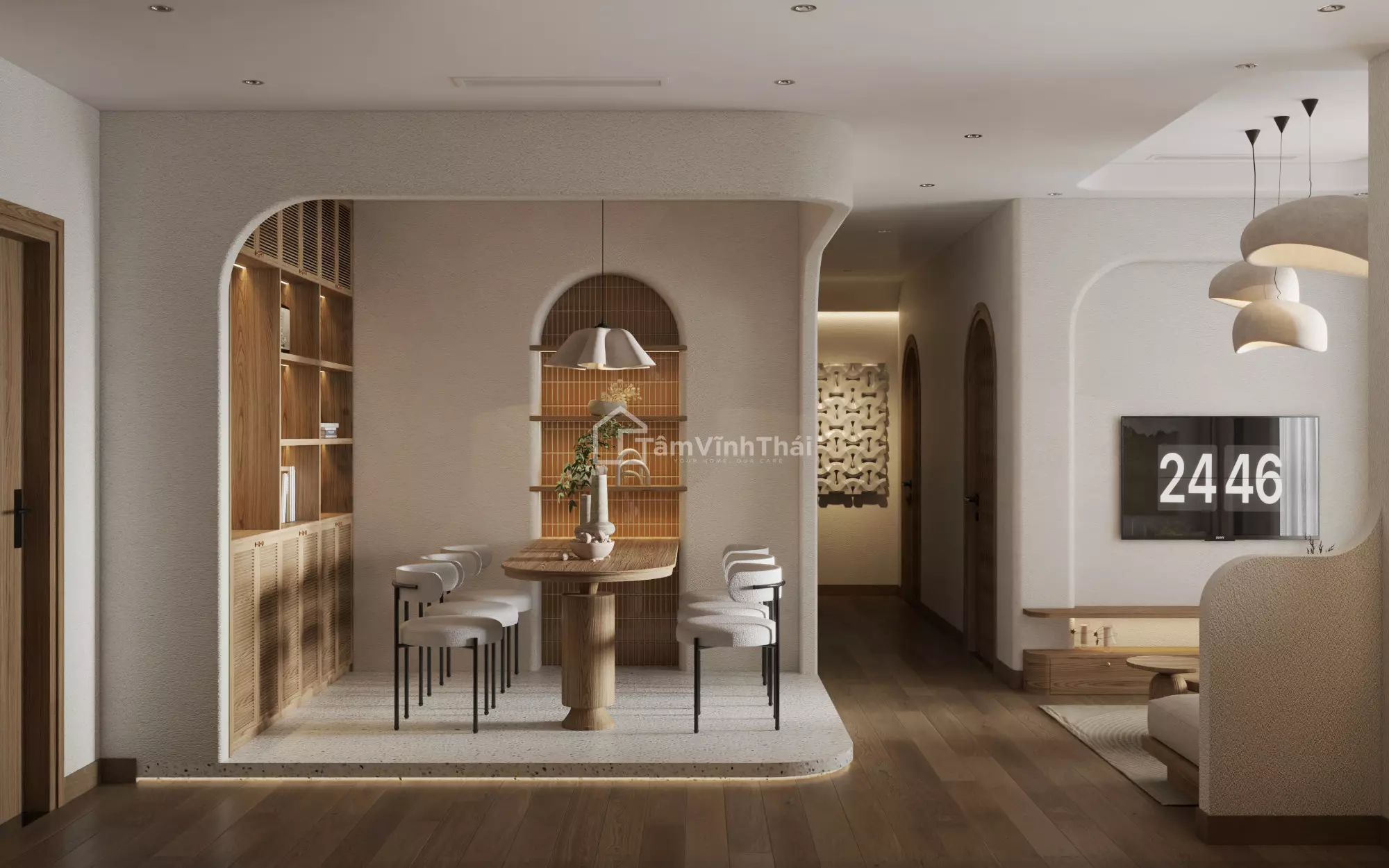 Lấy cảm hứng từ phong cách Wabi Sabi kết hợp thêm các đường nét mềm mại là “nguyên liệu” chính được Tâm Vĩnh Thái sử dụng trong thiết kế lần này.