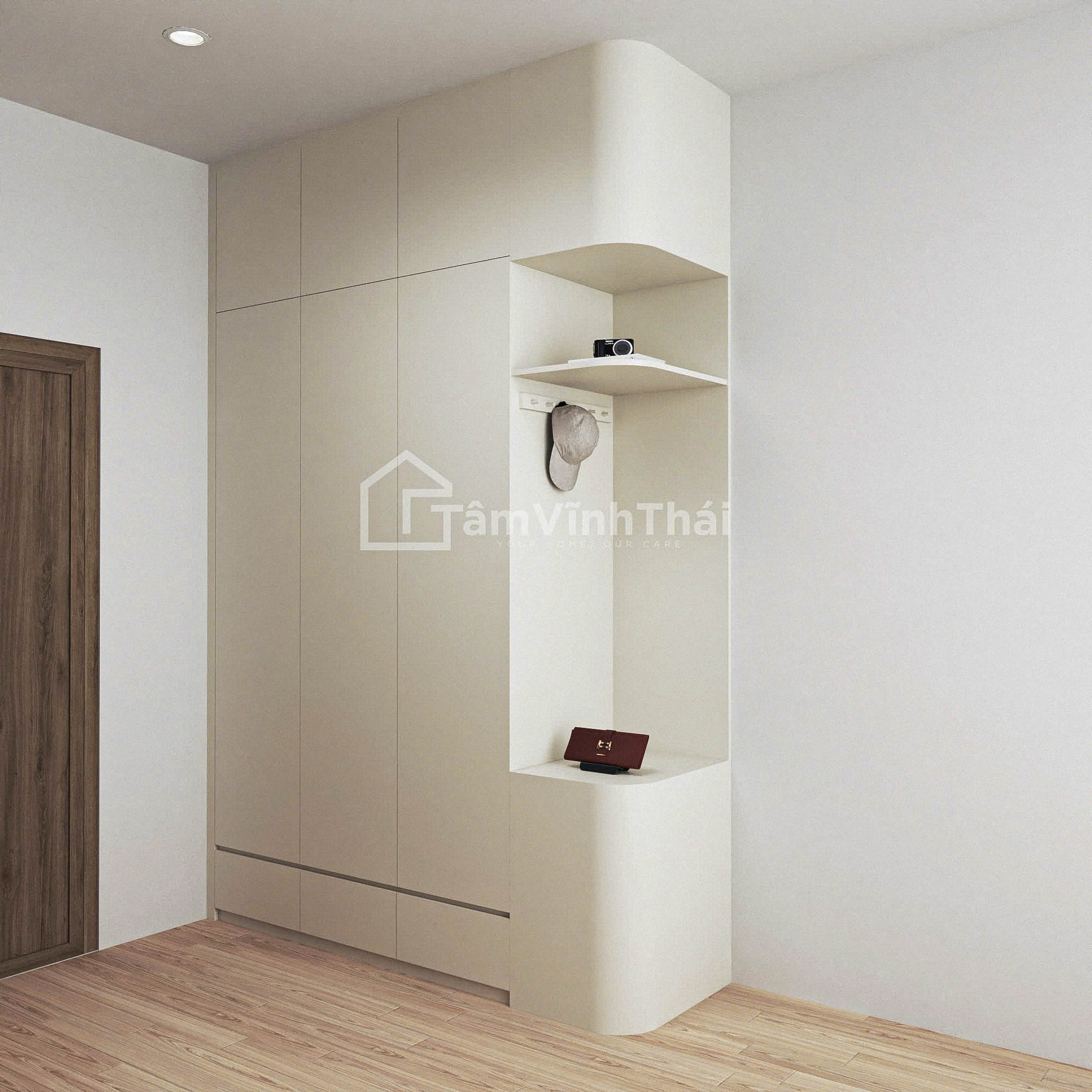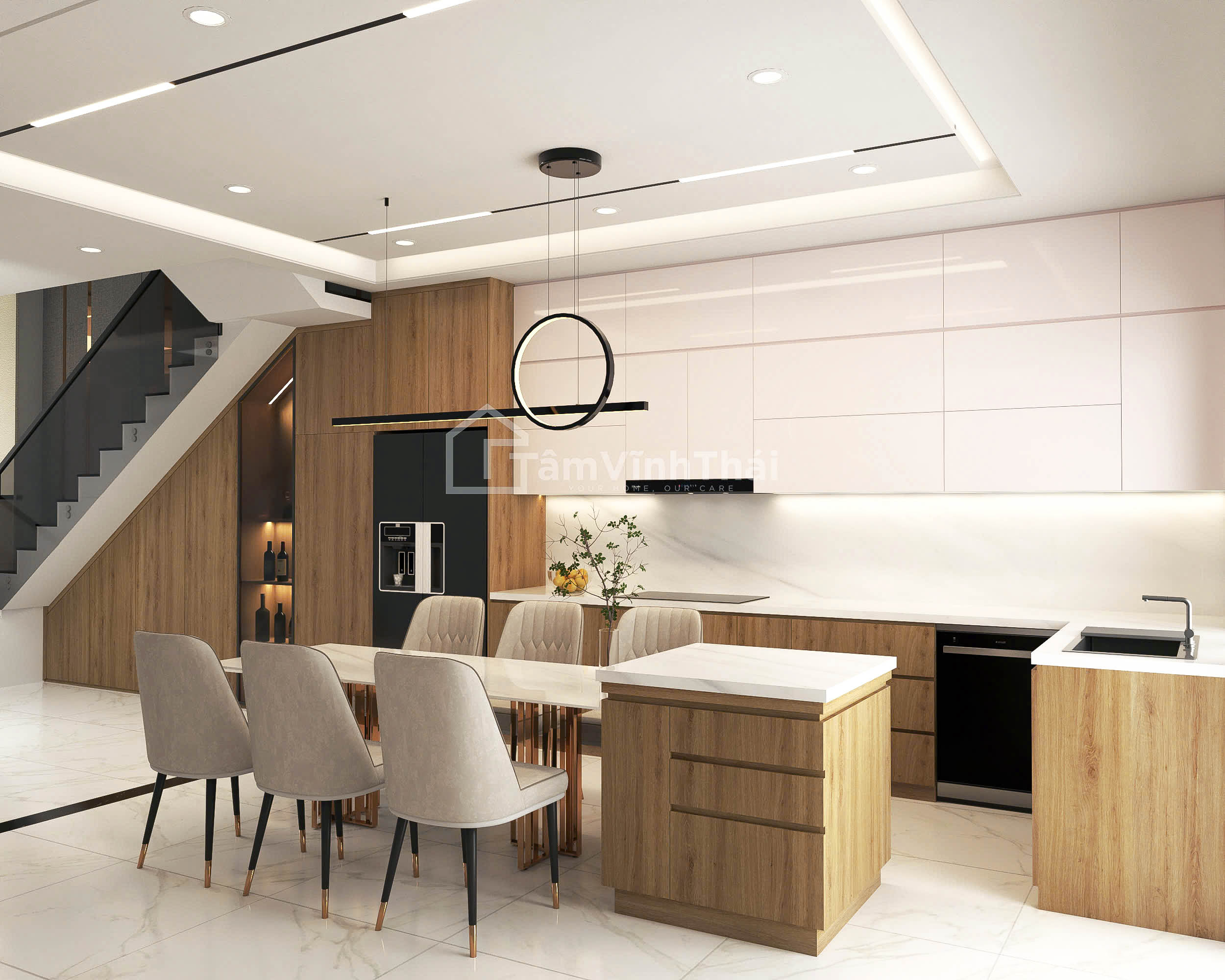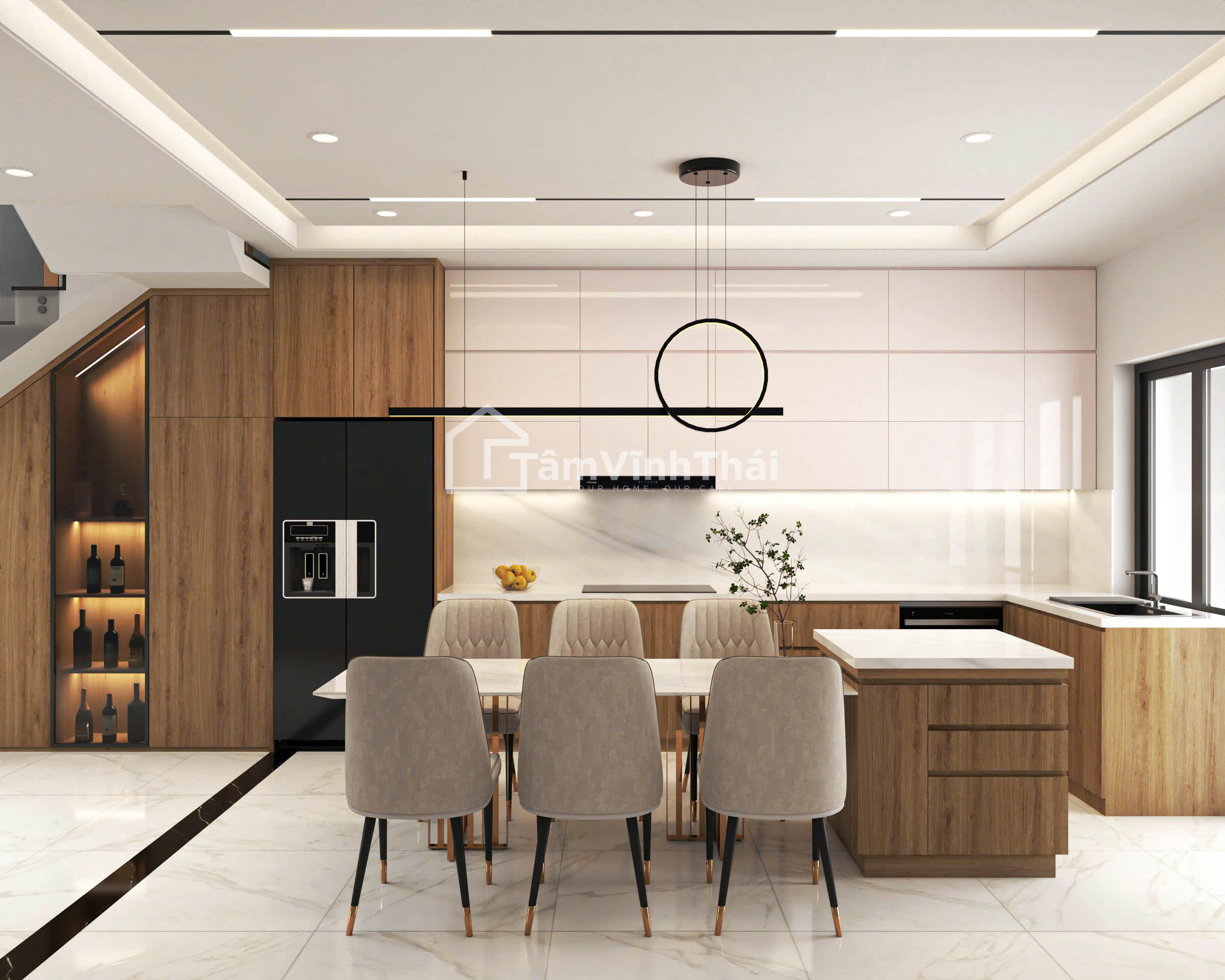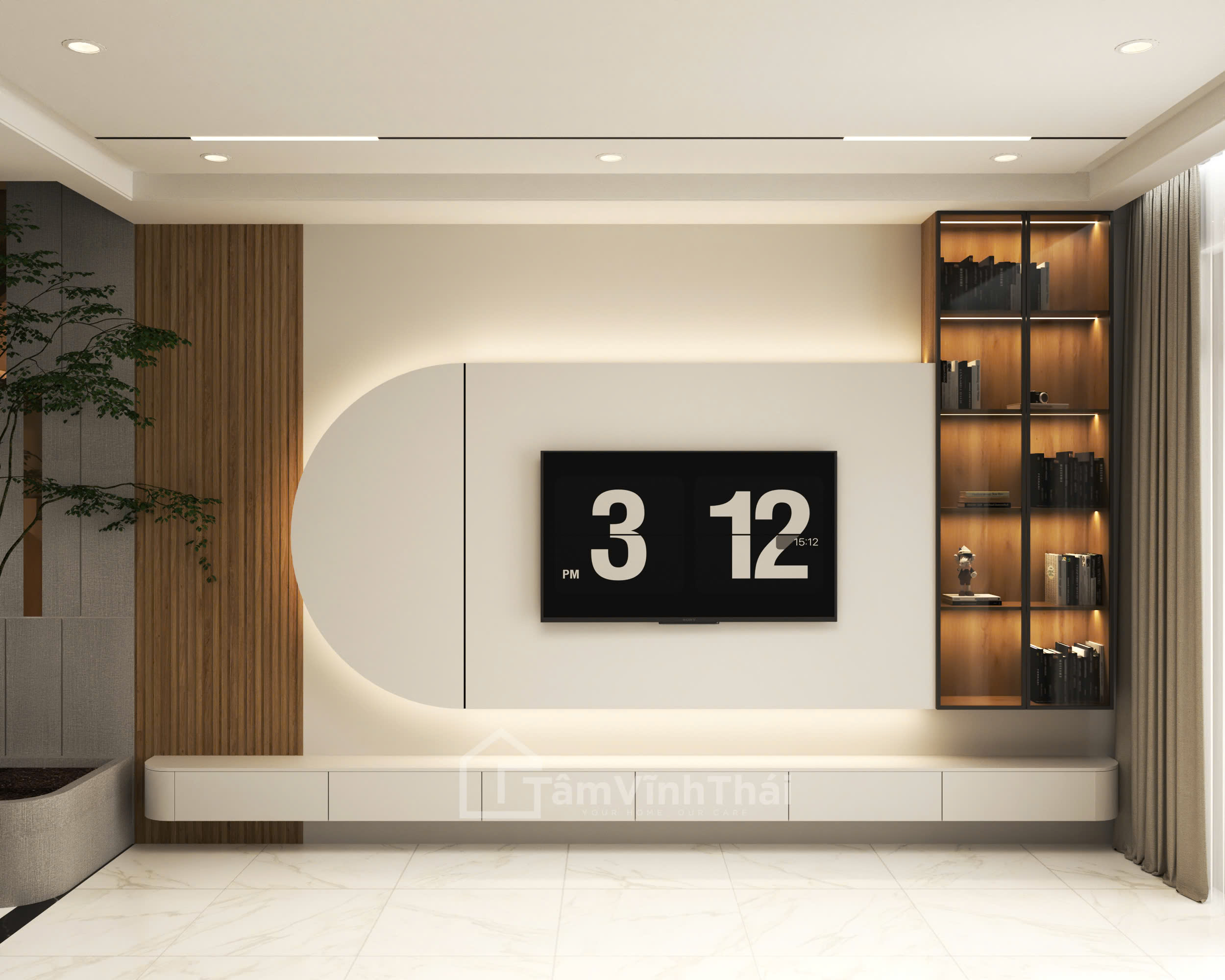 Thiết kế nội thất nhà chị Điệp được xây dựng dựa trên sự đơn giản với không gian mang sắc trung tính nhẹ, kết hợp chất liệu gỗ. Từng đường bo cong, từng chi tiết tủ kệ đều được thiết kế vừa với các không gian xung quanh tạo nên bố hài hòa,đẹp mắt. Ánh sáng được bố trí hợp lý, làm nổi bật các mảng tường và tạo chiều sâu tự nhiên cho căn nhà.