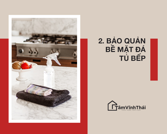 Sau khi nấu nướng, khó tránh khỏi những vết bám dính của đồ ăn hay dầu mỡ trên bề mặt đá tủ bếp. Do đó, 1 cách đơn giản, bạn chỉ cần nhỏ một chút giấm lên khăn khô; lau qua một lượt rồi sau đó lau lại bằng nước tẩy rửa; bề mặt đá sẽ trở nên bóng và sáng hơn.